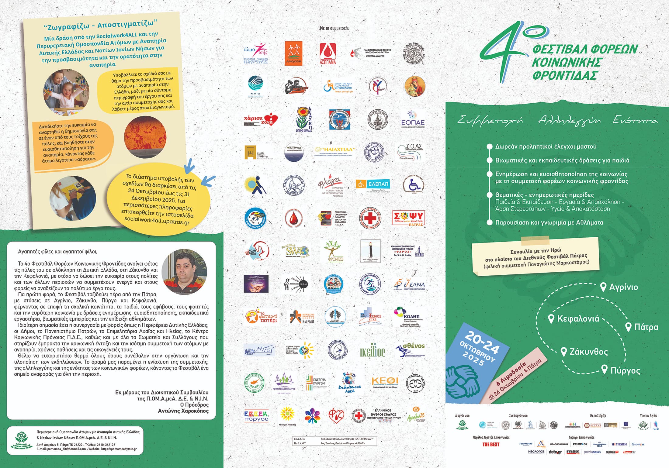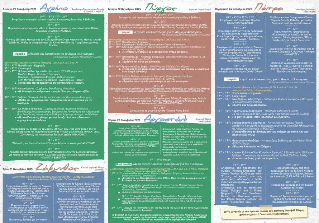 Η Περιφερειακή Ομοσπονδία Ατόμων με Αναπηρία Δυτικής Ελλάδας και Νοτίων Ιονίων Νήσων (ΠΟΜΑμεΑ Δ.Ε & Ν.Ι.Ν) προγραμματίζει τη διεξαγωγή του 4ου Φεστιβάλ Φορέων Κοινωνικής Φροντίδας Τριτη 21 Οκτωβρίου 2025, στο Κλειστό Δημοτικό Θέατρο στη Ζάκυνθο, Τετάρτη 22 Οκτωβρίου στην Κεφαλονιά και Παρασκευή 24 Οκτωβρίου στην Ιχθυόσκαλα στην Πάτρα.