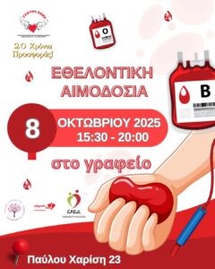 Ο ΣΕ ΚΟΖΑΗΣ "Γέφυρα ζωής " σας προσκαλεί στις 8 Οκτωβρίου σε αιμοδοσία από τις 15:30 – 20:00 (προσέλευση μέχρι 19:30) στα γραφεία του Συλλόγου, Π. Χαρίση 23 με το τμ. Αιμοδοσίας του «Μαμάτσειου» Γ.Ν. Κοζάνης Παράλληλα θα γίνεται δειγματοληψία σάλιου και εγγραφές εθελοντών δοτών μυελού των οστών σε συνεργασία με το ΚΕΔΜΟΠ-"Χάρισε ζωή" Η […]