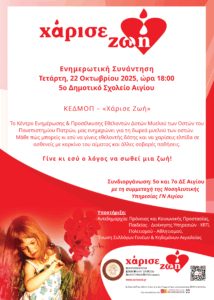 ΓΝ ΑΙΓΙΟΥ Νοσηλευτική Υπηρεσία εγγράφει νέους εθελοντές δότες μυελού των οστών από τα μέλη των συλλόγων γονέων & κηδεμόνων του 5ου & 7ου Δημοτικού Σχολείου Αιγίου στις 22 Οκτωβρίου από τις 18:00-21:00 σε συνεργασία με το ΚΕΔΜΟΠ-"Χάρισε ζωή" ΣΥΝΔΙΟΡΓΑΝΩΣΗ : 5ο & 7ο ΔΗΜΟΤΙΚΟ ΣΧΟΛΕΙΟ ΑΙΓΙΟΥ Με την υποστήριξη : ΑΝΤΙΔΗΜΑΡΧΕΙΑ ΠΡΟΝΟΙΑΣ & ΚΟΙΝΩΝΙΚΗΣ ΠΡΟΣΤΑΣΙΑΣ, […]