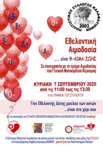 Ο Συλλόγου Εθελοντών Αιμοδοτών "ΠΑΝΔΟΤΗΣ" σε συνεργασία με το τμήμα αιμοδοσίας του Γενικού Νοσοκομείου και το ΚΕΔΜΟΠ-"Χάρισε ζωή" διοργανώνει εθελοντική αιμοδοσία και λήψη δειγμάτων μυελού των οστών στις 7/9 στις Καλαφατιωνές